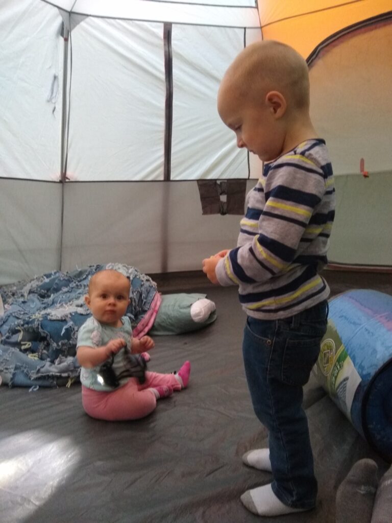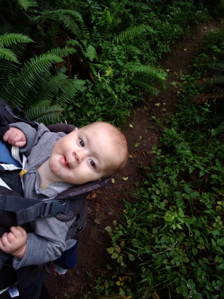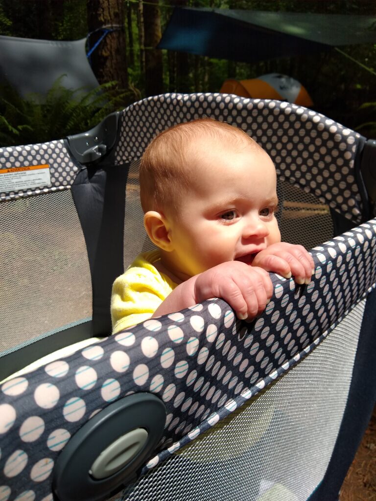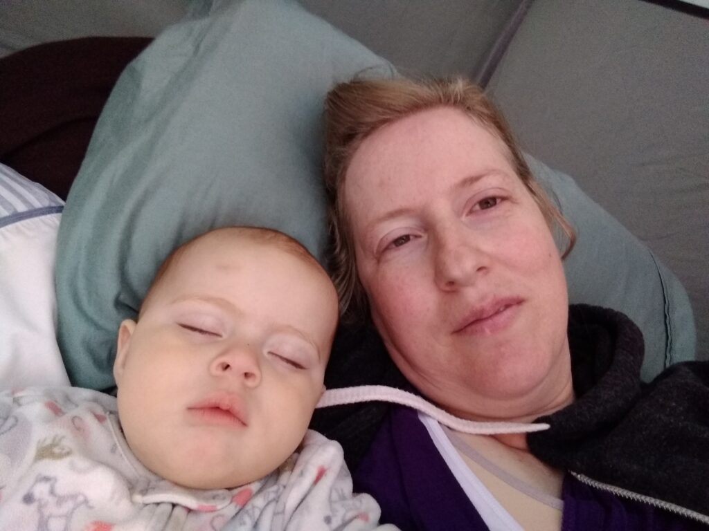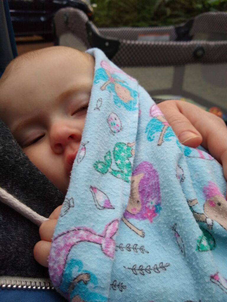 Along the way we found all kinds of cool things! Slugs, snails,twin trees, mushrooms (I mean…they really grow out of trees like that? What!? I thought that was only in the movies), and wildflowers. So many beautiful things!Mid-hike Carolynn needed to be fed (I’ll talk about this on another post). After getting her tummy full, this is her soaking in all the wonder of nature.First hike!All this hiking wore little munchkin out! While I was hiking I kept pondering on how lucky babies have it. I mean, they can just fall asleep anywhere and someone else will carry them. Also, carrying 17 pounds of dead weight gets tiring really quick.About this point in the hike it’s been an hour. We started wondering if we were ever going to reach the end of the trail. Here’s Braxton carrying Tyler after he tired out too. Lucky for us, it didn’t really get warmer than upper 60’s. So even though we’d been hiking longer than expected (and now carrying dead weight), the cool air made it much more tolerable.Sleeping baby, sweaty mommy. Still, I enjoyed the hike. It was so nice to get outside again and enjoy nature.Sleepy TylerWe made it back to camp! Tyler is enjoying a delicious peanut butter and jelly sandwich.Carolynn playing with some toys in her pack n play. She absolutely loved being outside.Snuggly Tyler.Checking out Daddy as he makes dinner (spaghetti in a dutch oven…yummy!)Napping baby girlHere we are the second morning. The birds woke us up at 5:30 am, but luckily my children like their sleep. We were able to sleep in despite the birds and the early rising sun.