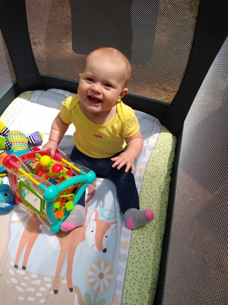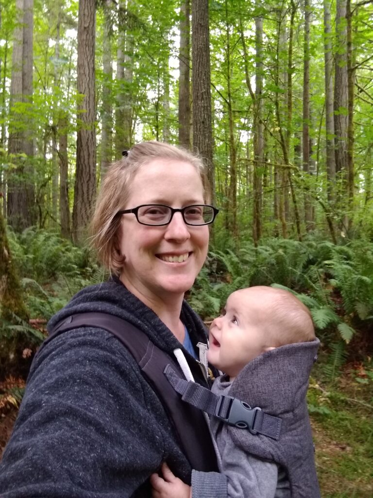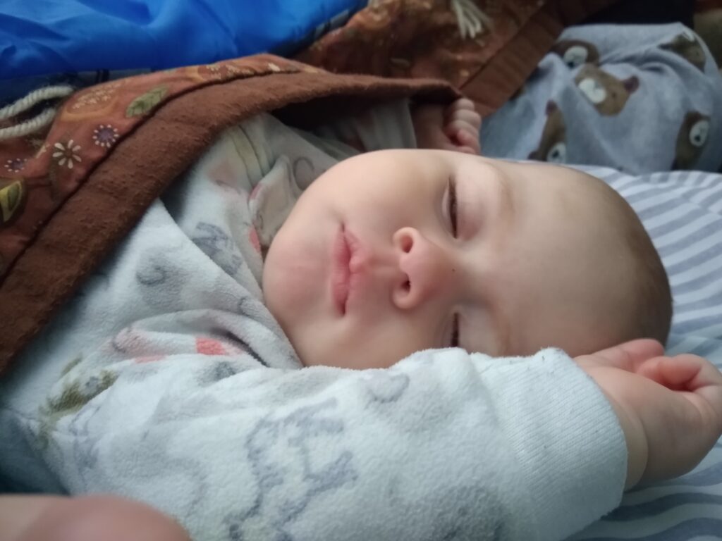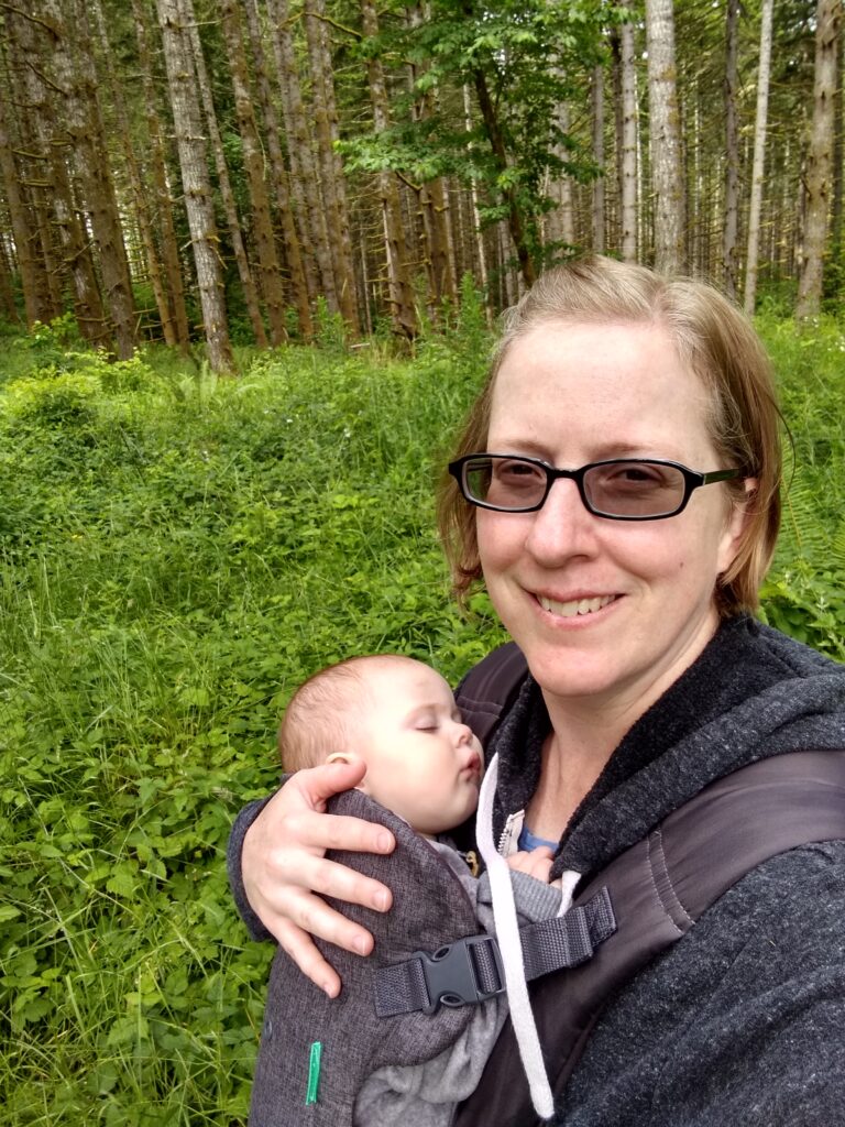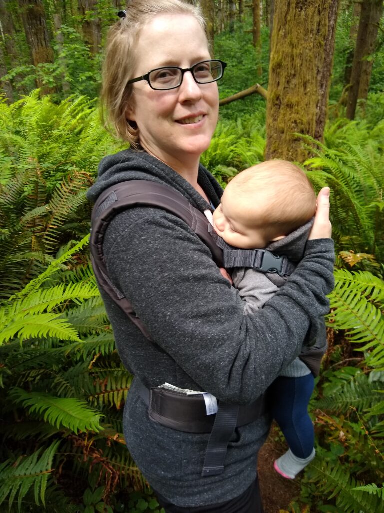 Along the way we found all kinds of cool things! Slugs, snails,twin trees, mushrooms (I mean…they really grow out of trees like that? What!? I thought that was only in the movies), and wildflowers. So many beautiful things!Mid-hike Carolynn needed to be fed (I’ll talk about this on another post). After getting her tummy full, this is her soaking in all the wonder of nature.First hike!All this hiking wore little munchkin out! While I was hiking I kept pondering on how lucky babies have it. I mean, they can just fall asleep anywhere and someone else will carry them. Also, carrying 17 pounds of dead weight gets tiring really quick.About this point in the hike it’s been an hour. We started wondering if we were ever going to reach the end of the trail. Here’s Braxton carrying Tyler after he tired out too. Lucky for us, it didn’t really get warmer than upper 60’s. So even though we’d been hiking longer than expected (and now carrying dead weight), the cool air made it much more tolerable.Sleeping baby, sweaty mommy. Still, I enjoyed the hike. It was so nice to get outside again and enjoy nature.Sleepy TylerWe made it back to camp! Tyler is enjoying a delicious peanut butter and jelly sandwich.Carolynn playing with some toys in her pack n play. She absolutely loved being outside.Snuggly Tyler.Checking out Daddy as he makes dinner (spaghetti in a dutch oven…yummy!)Napping baby girlHere we are the second morning. The birds woke us up at 5:30 am, but luckily my children like their sleep. We were able to sleep in despite the birds and the early rising sun.