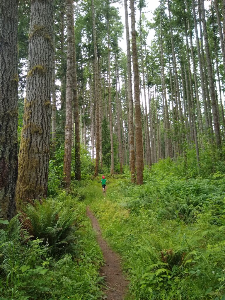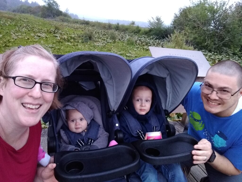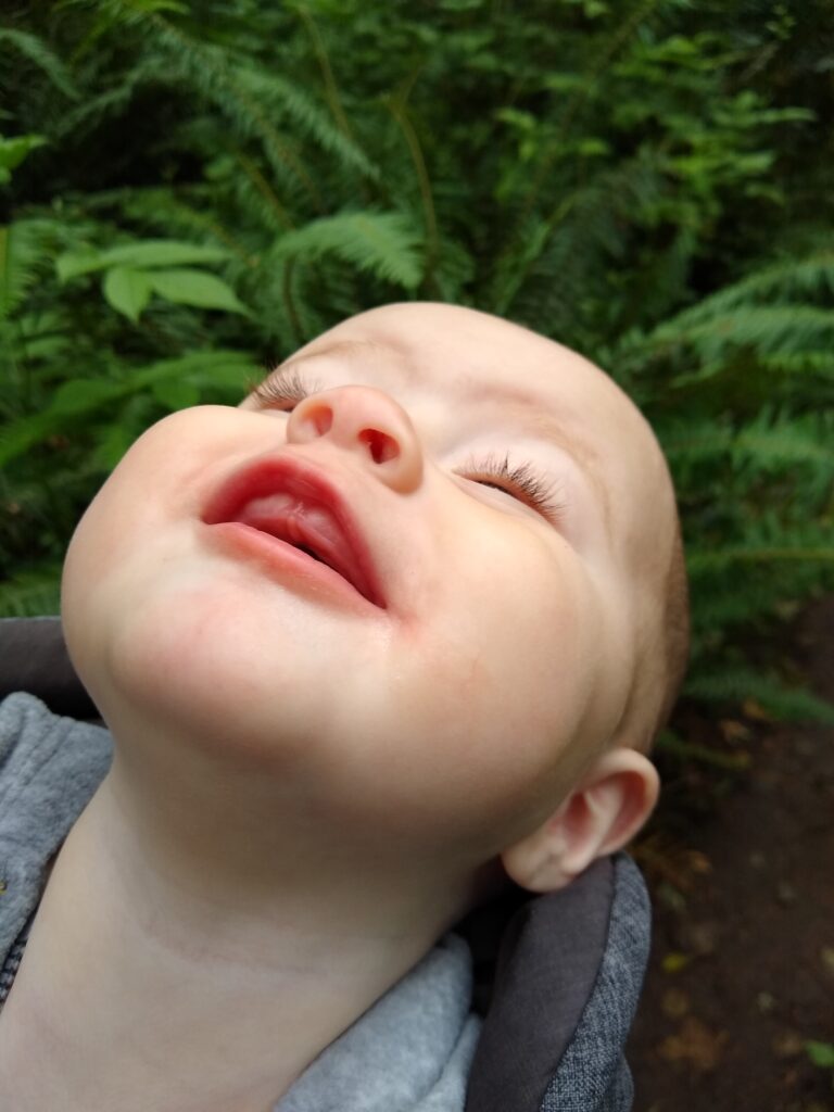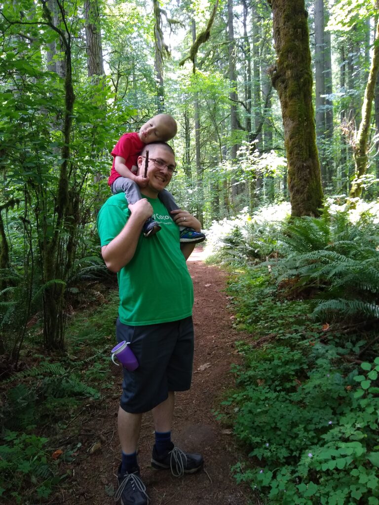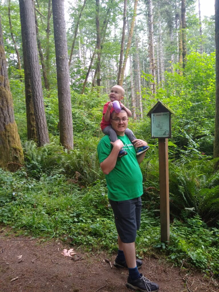 This is our beautiful campsite. We purchased an 8 person octagon shaped tent. It’s 6’10” in the center. This means Braxton can comfortably stand inside. It was perfect for our family. Also…so many really tall trees!!The kids LOVED the tent. It was very spacious and they took full advantage of running everywhere.We have this headlamp that turns on by finger motion instead of a button. Braxton and I struggled getting it to turn on. It didn’t matter how we moved our finger…it wouldn’t turn on, ARGH!So, of course baby turned it on. What she did, I have no idea. She needs to teach us oldies how to use modern technology hahaha.It’s kind of blurry because Tyler was moving as the picture was being taken. Here are the kids, absolutely thrilled with the idea that there is a bed inside the tent.The first evening at the campsite was kind of misty raining. Not enough to get soaked, but enough to feel like you were in a grocery store produce section. We decided to walk around the lake that had a “great” view of Mount St. Helens. Since we try to get an annual picture of our family by Mount St. Helens (and the Corona Virus shutting things down) we thought this would be a great opportunity to get our family picture here. Here it is…in all it’s glory.I was a bit worried about keeping munchkin warm through the night. I put a set of clothes on under her pajamas and wrapped her in her sleep blanket. It still wasn’t enough. So…into our sleeping bag she came. Let’s just say 2 adults and 2 kids on one queen sized air mattress wasn’t the ideal comfort. That being said, everyone being warm and sleeping was a success.Here we are in the morning. I wouldn’t say I had the best nights sleep, but munchkin did.After a yummy breakfast of cereal and milk we decided to go on a hike. Braxton picked a trail that looked long enough to be fun, but not too long to be exhausting. He picked up Tyler, I strapped Carolynn to me and off we went….on an adventure!Carolynn is so excited for the new things she’ll see.This is the picture I got when I said “look over here and smile” hahaha… I love my boys. Here is the map we used to pick the trail.So magical! I loved it! I grew up in Utah and I thought I knew green and trees. Nope! This place was amazing! I totally LOVED it.Tyler exploring on his own.